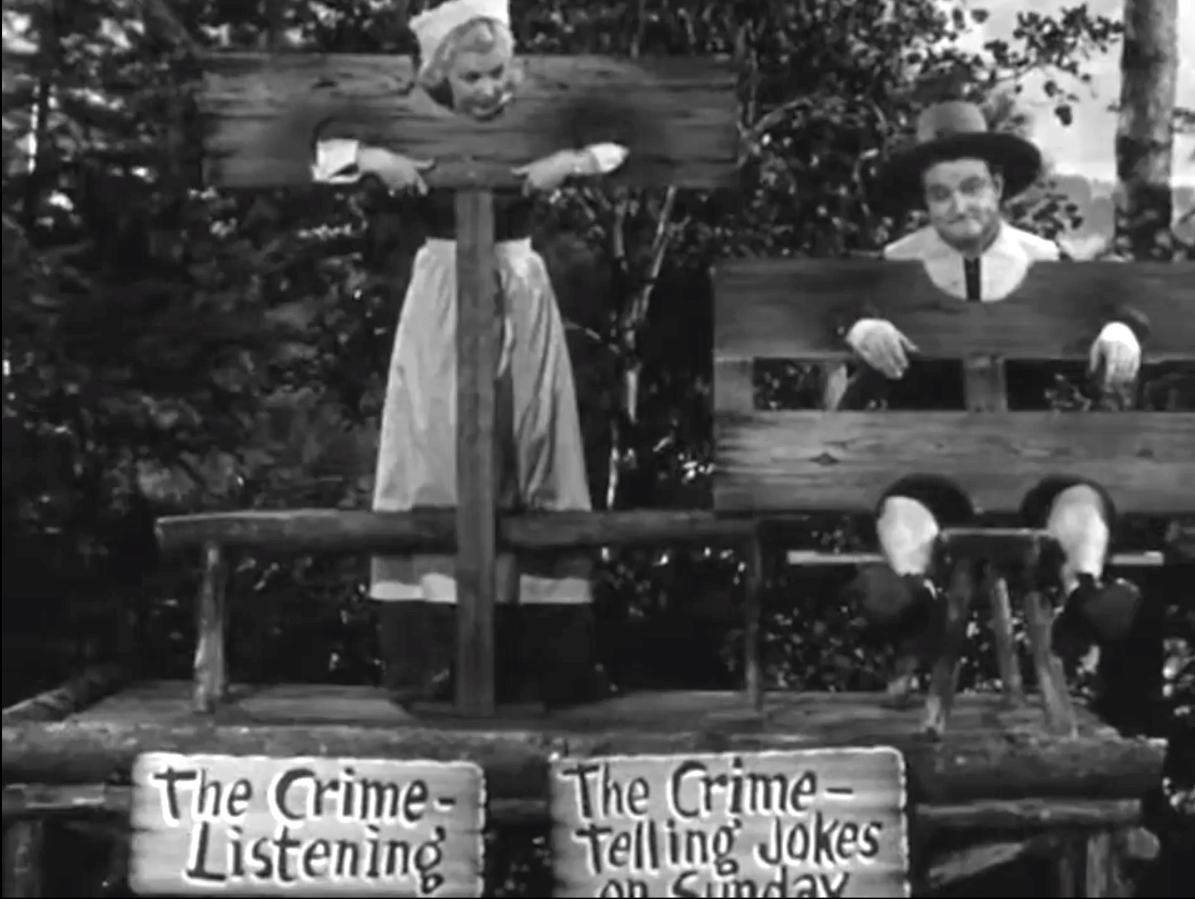 Lucille Knoch and Red Skelton as pilgrims in stocks in “Weepy Talks Turkey“