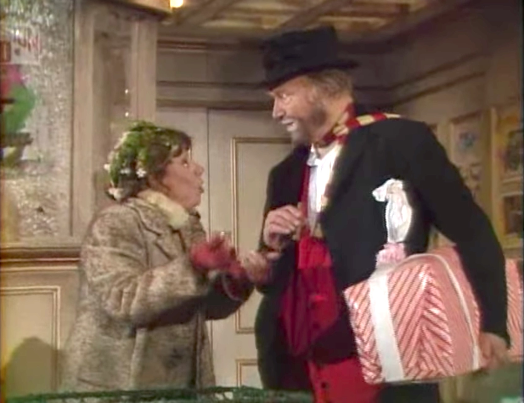 Imogene Coca as a bag lady chatting with Freddie the Freeloader in Red Skelton’s Christmas Dinner