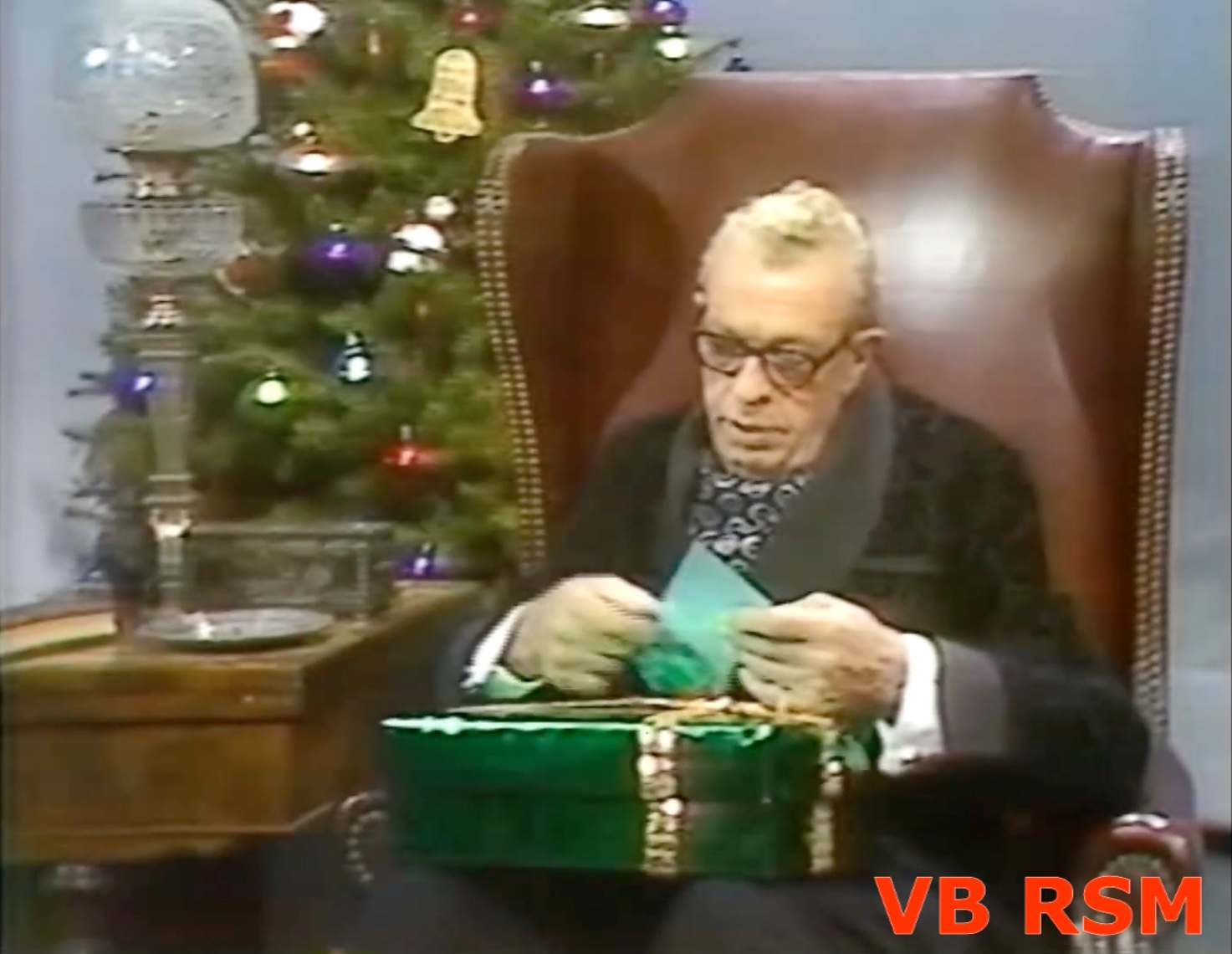 US Senator Everett Dirksen of Illinois appears next seated in a comfortable easy chair in a homey room with a fireplace, Christmas tree, and stockings hung on the fireplace. Dirksen recites ‘A Visit From St. Nicholas.’