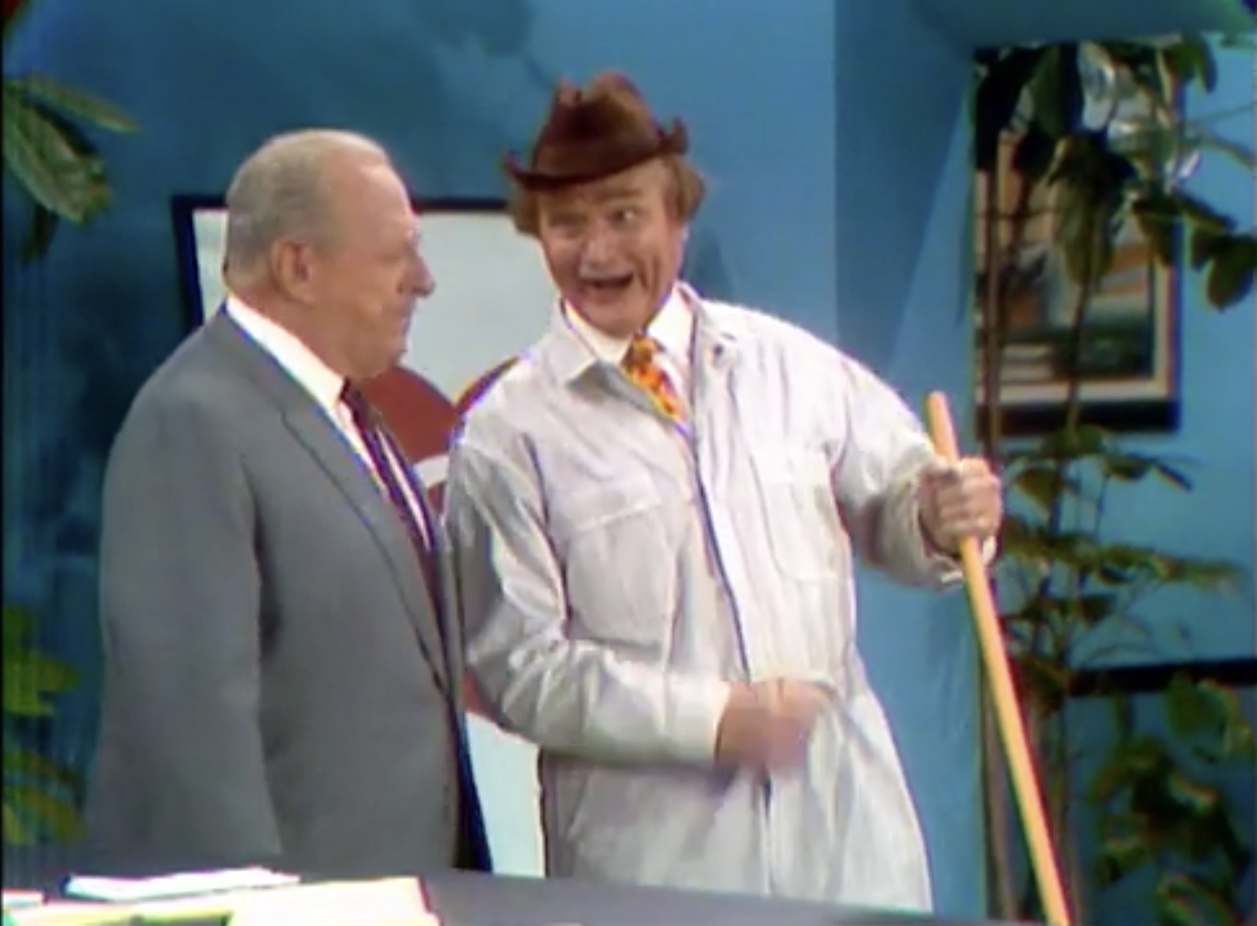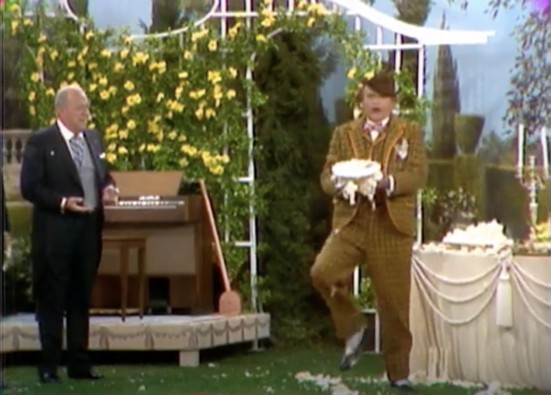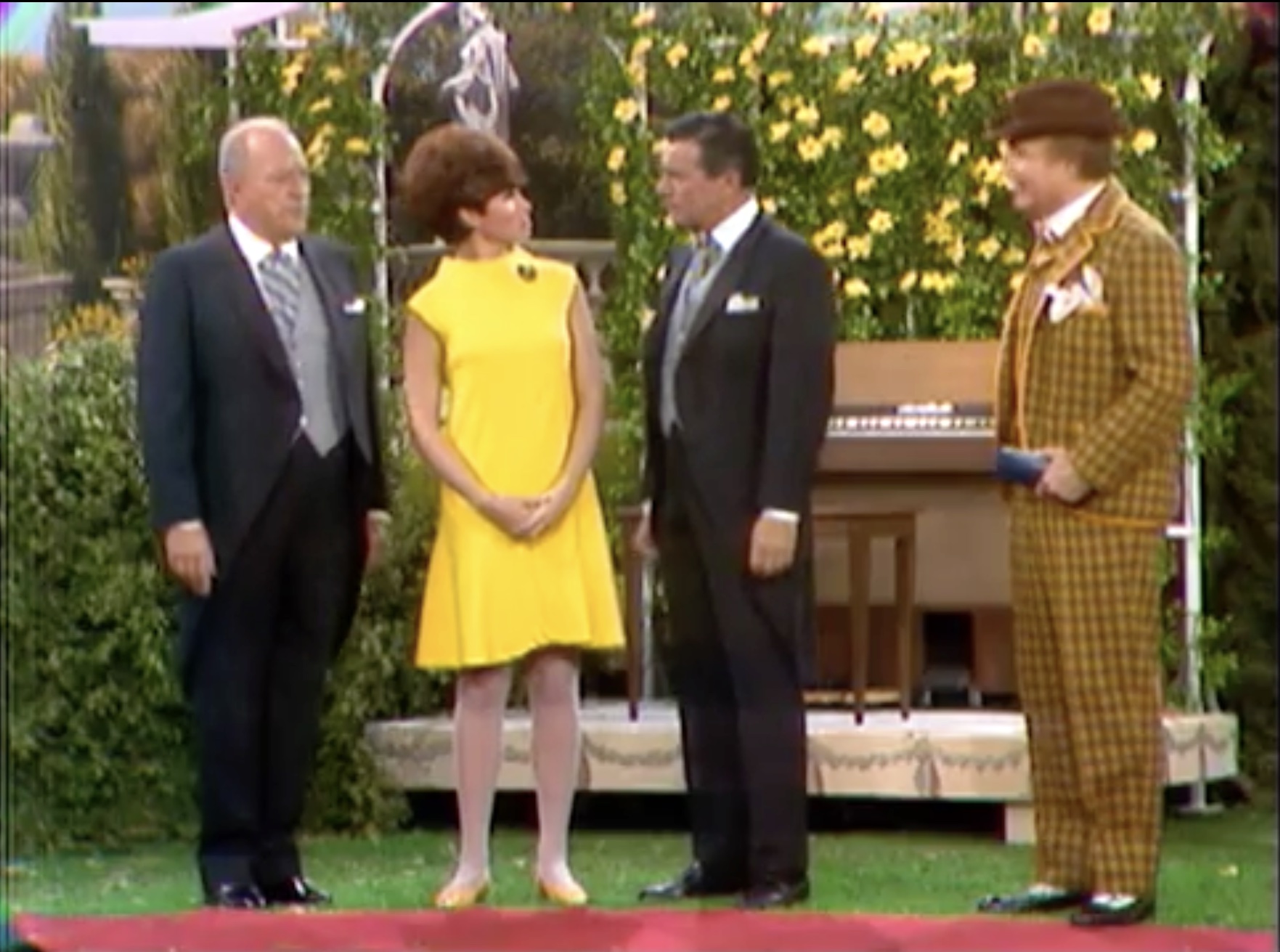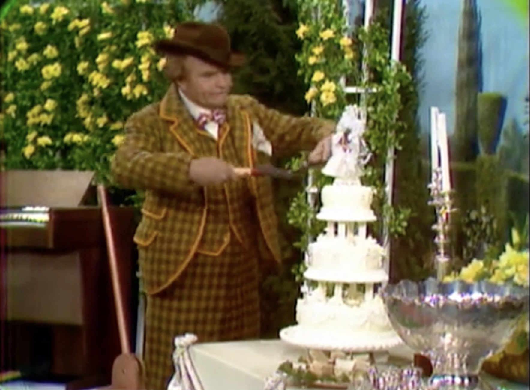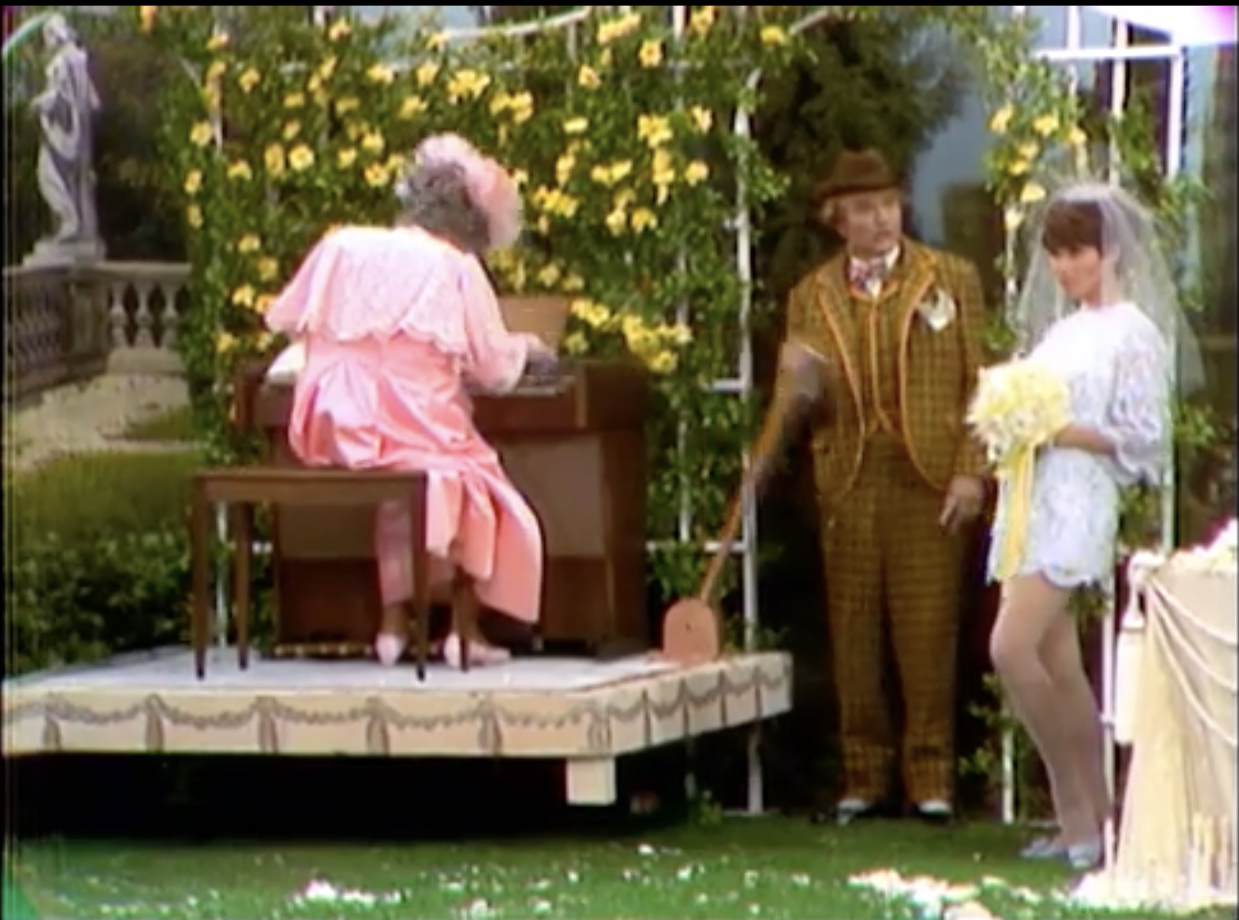 After getting the organist drunk (again) on his spiked punch, he pumps the organ handle. And lifts the entire platform off the ground! Then the poor organist falls off the elevated platform onto the hedges. It’s time for the ceremony, and Clem needs to delay five more minutes. So, he takes the bride-to-be off screen. Apparently, he’s “told her that she’s Billy Jo and pointed out the Tallahassee bridge”, ending the sketch.