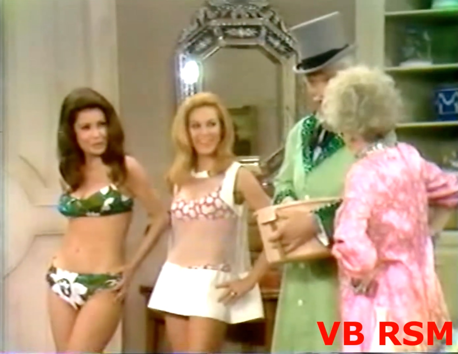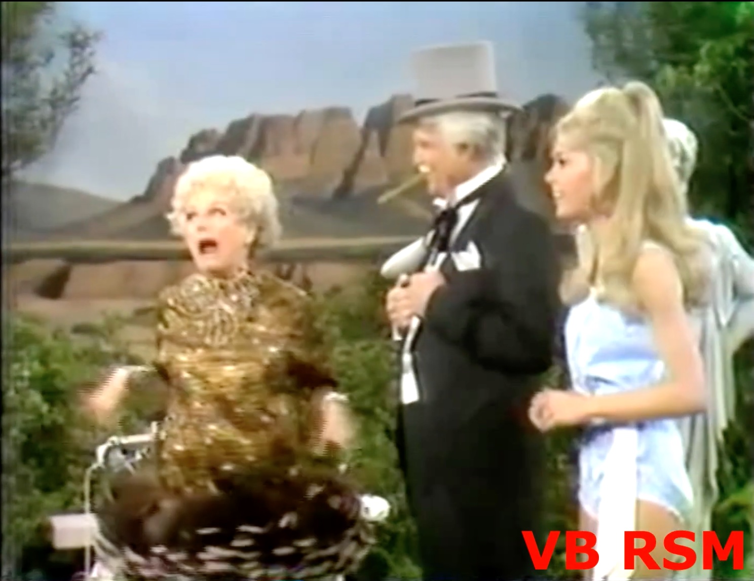 San Francisco, being a con man at heart, he uses the mirror gag to try & fool Bobo into thinking that his beauty treatment worked! It’s a funny bit, but she sees through it (pardon the pun) and goes to call the police! To get rid of the evidence, San Fernando Red throws his beauty cream out the door — where it hits one of his guinea pigs, turning her into a Phyllis Diller lookalike! Bobo: “She’s gorgeous!” So, they celebrate by drinking it — San Fernando gets Phyllis Diller’s hair, and she gets his mustache! Ending the sketch.
