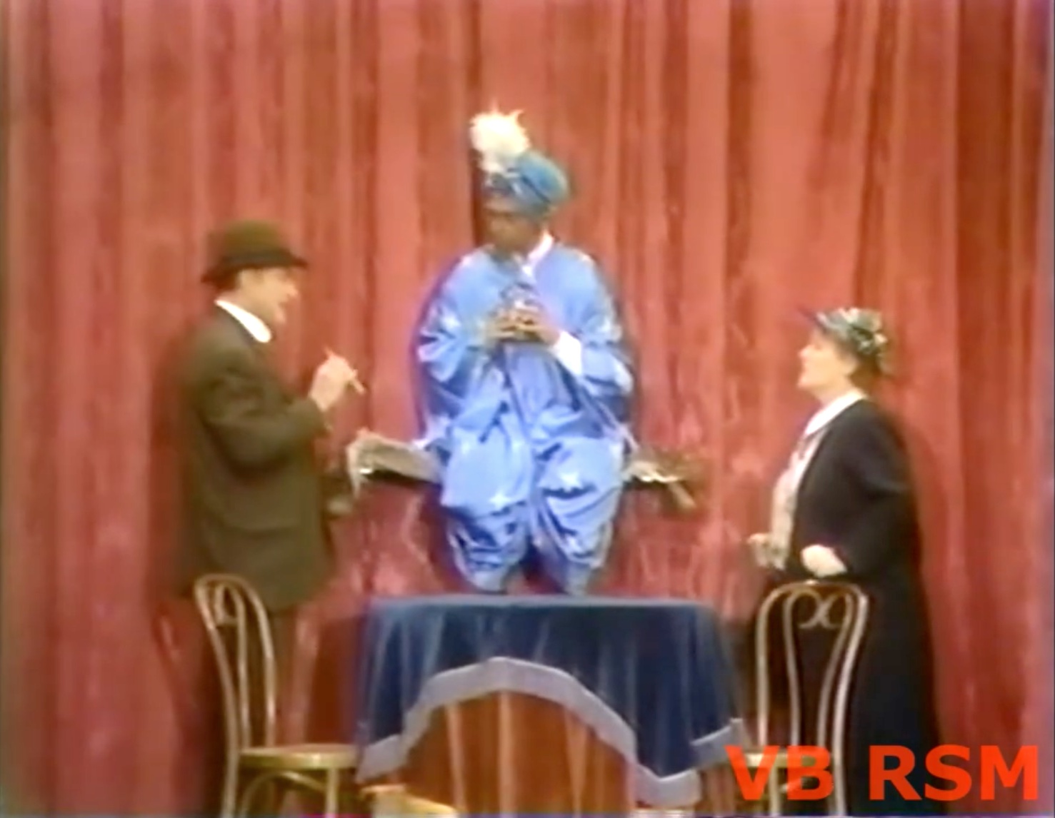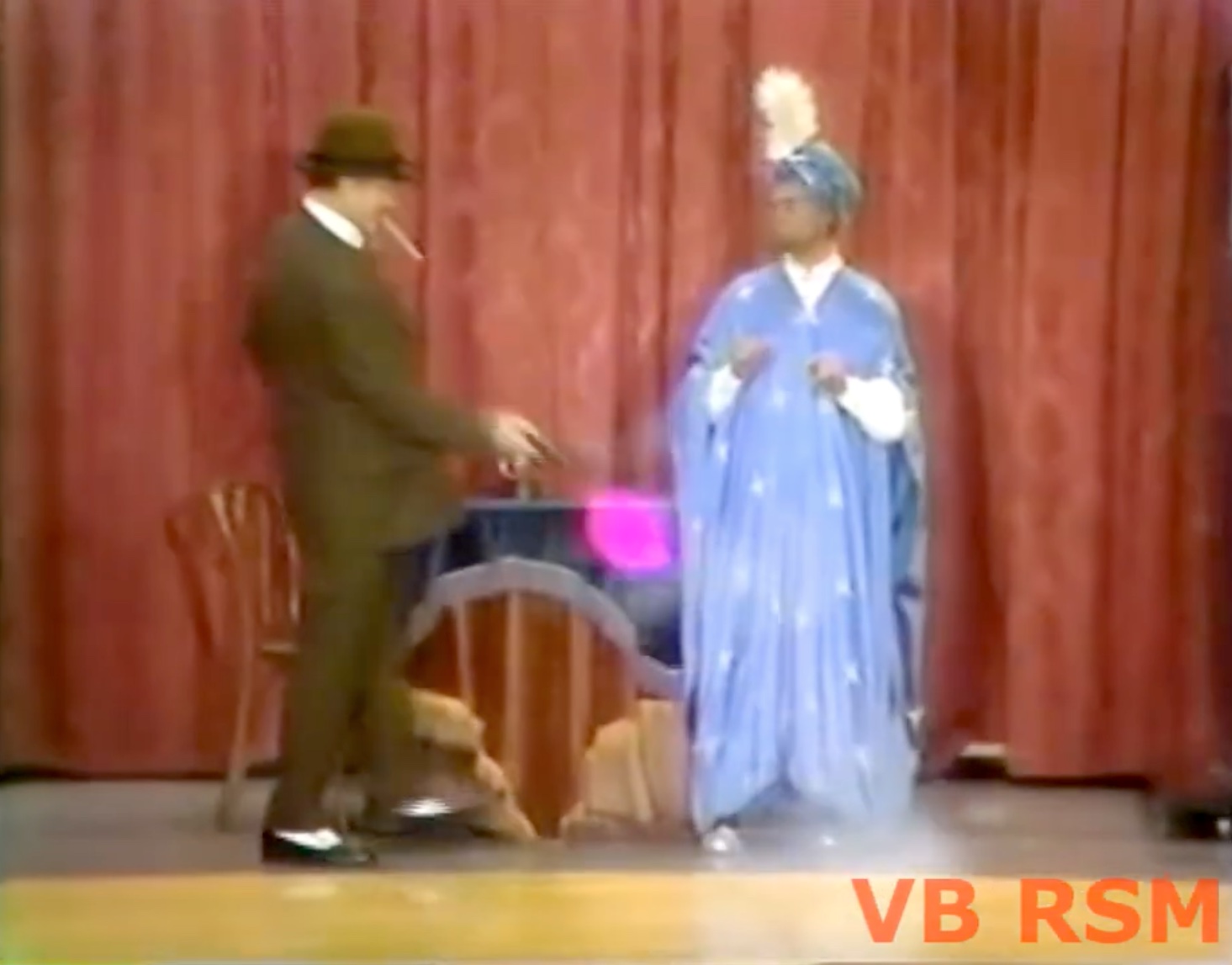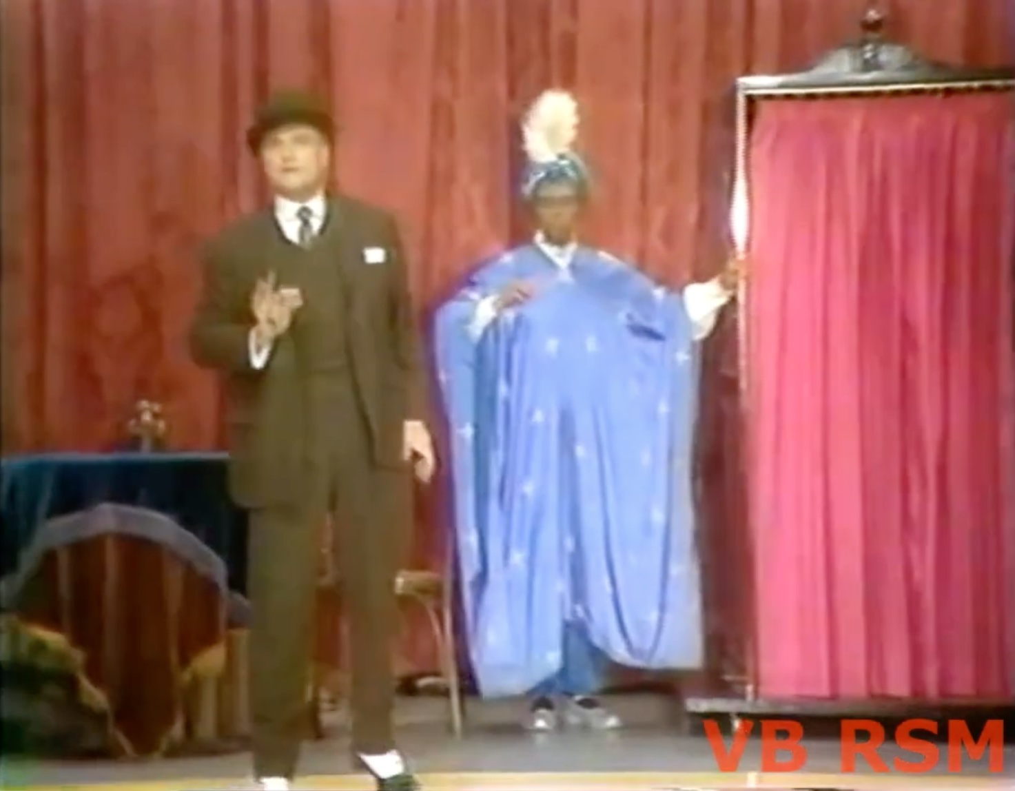 In the Swami, sketch, Red plays a loudmouth husband and his wife, going to a vaudeville show, where they’re “sneaking” on stage to visit the Swami. He levitates in, and offers to share his knowledge. To show his power, he has the wife enter a booth, and makes her vanish! Red’s quite happy with this, until the Swami is about to bring her back! So he shoots him!