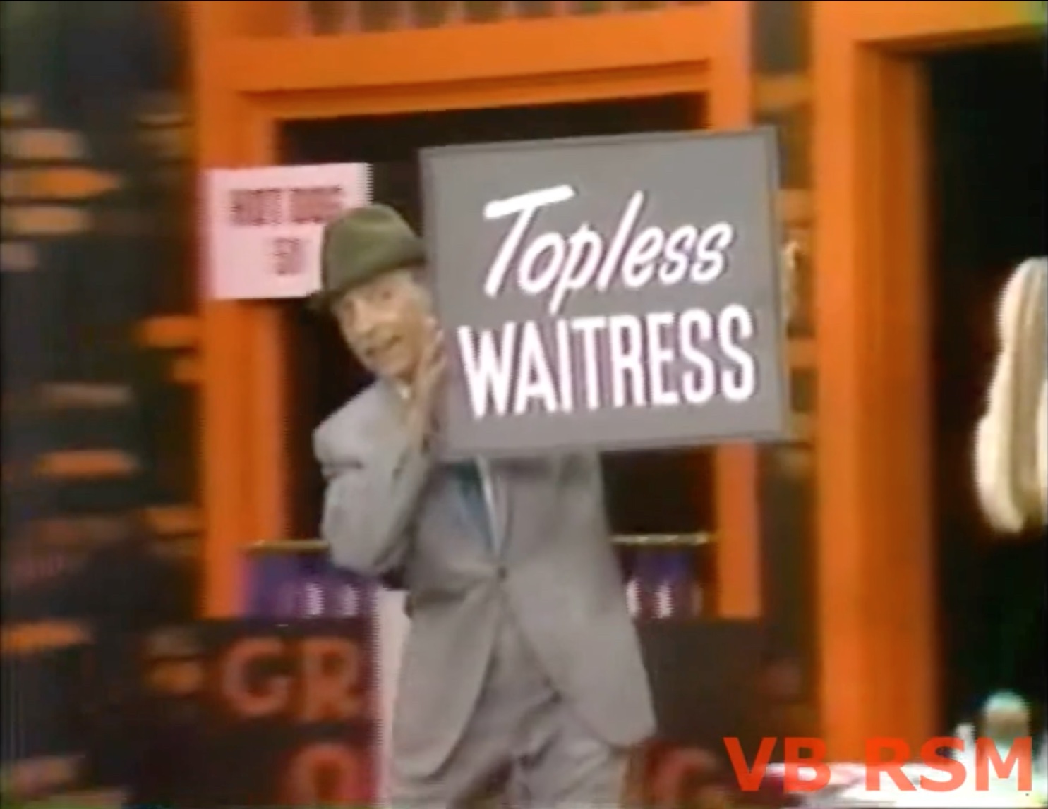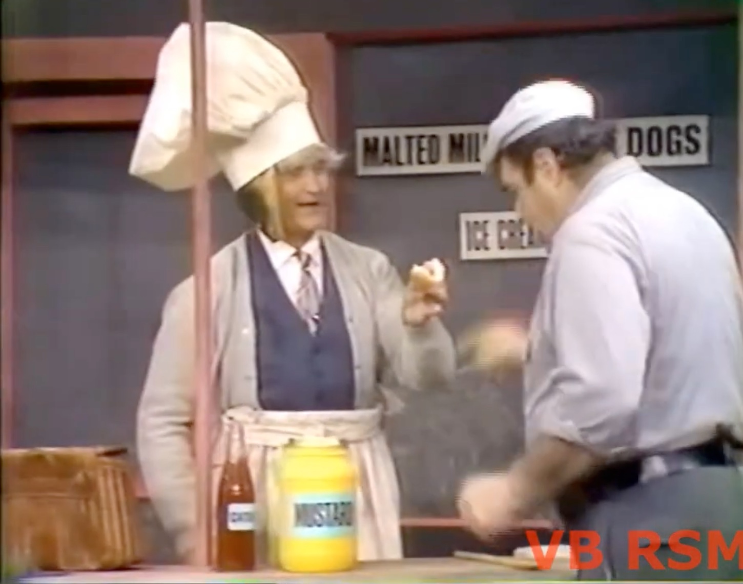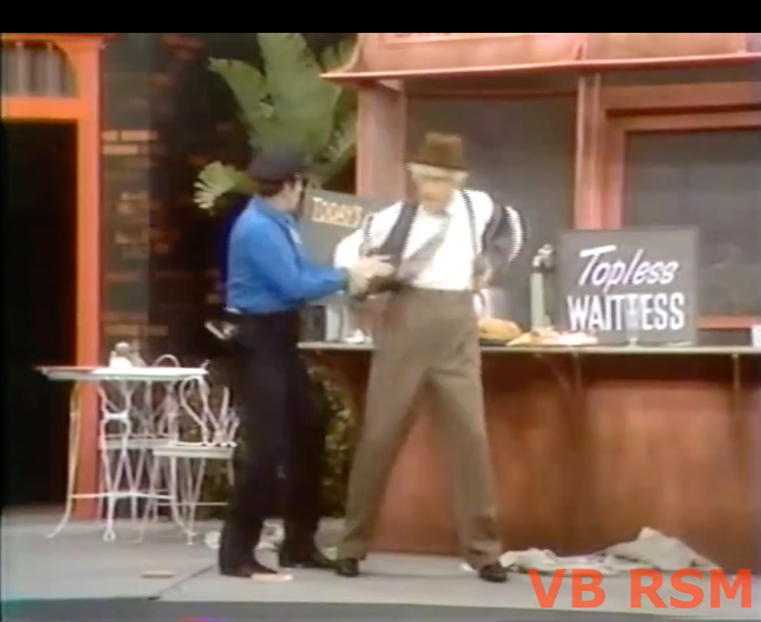 But wait! The competitor’s not done yet! He’s hired a topless waitress! Not to be outdone, Pops starts stripping down — thankfully a police officer comes by and arrests him first, ending the skit!