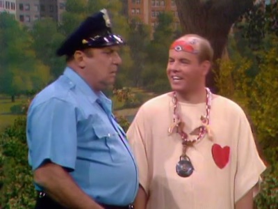 The reluctant cop (Jackie Coogan) has to chase Freddie the Freeloader & his pal Mugsy from the park. The hippies are having a love-in, with police protection. Soon, the hippies come in, with their leader — Tim Conway! And they bring in a table of balloon “heads” to represent the things the hippies hate. Hard work, clean underwear ….