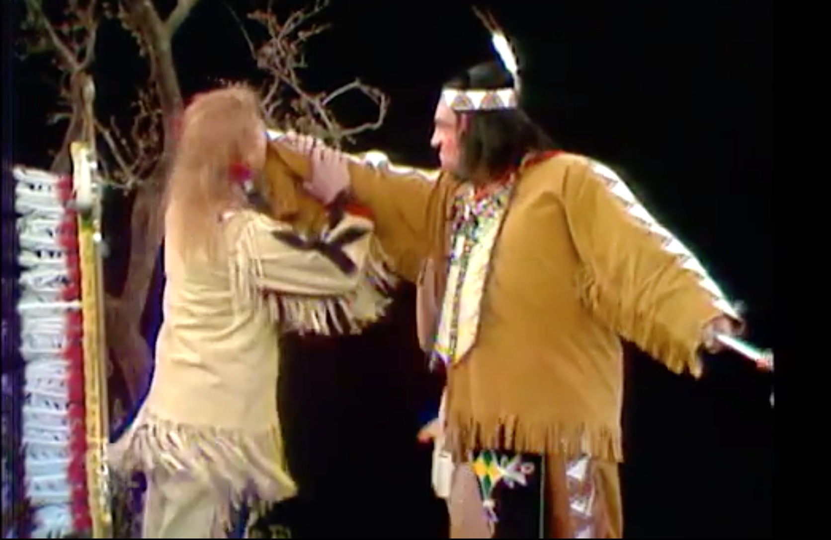 Red plays an Indian caught in a love triangle. Oddly enough, it’s the bully that’s the coward! A very funny segment, with lots of visual humor.