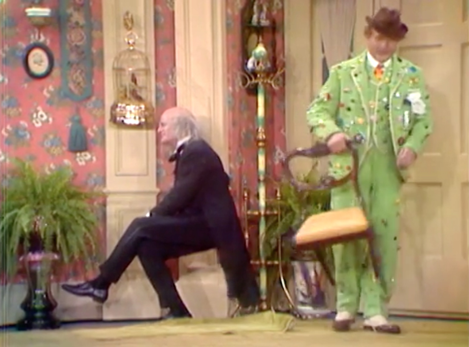 While the brothers are fighting over doing the laundry, wealthy Mrs. Abercrombie comes by with a load of laundry. Amidst Clem’s multitude of fat jokes, Liberace plays a tune on his toy piano. And he’s hired by her to play at her musicale that night! And Clem … gets to turn the pages on his brother’s music.