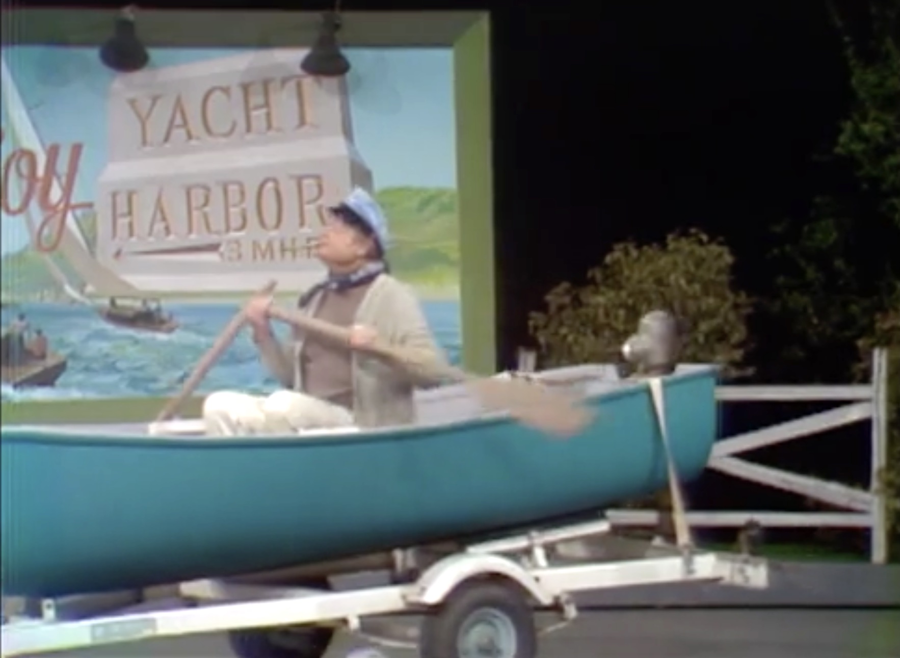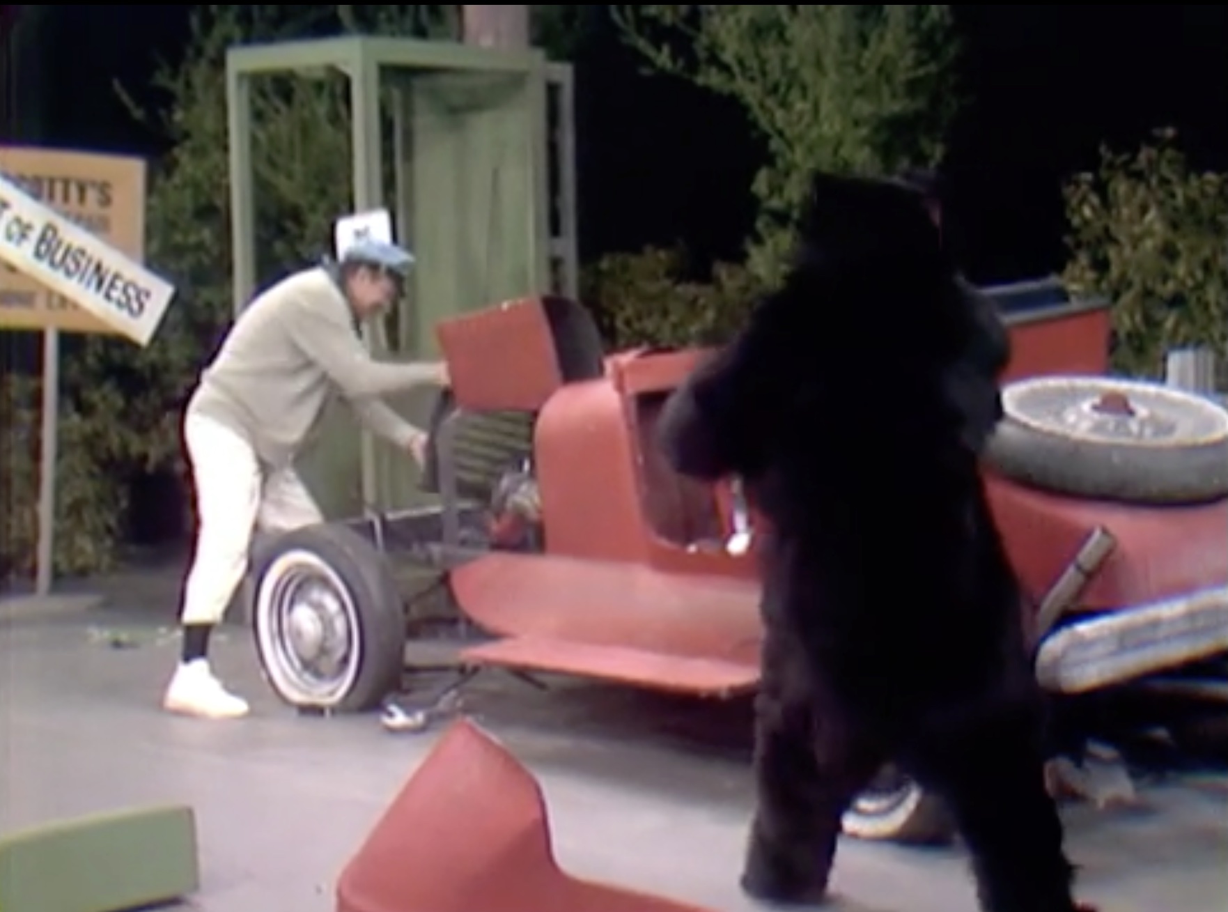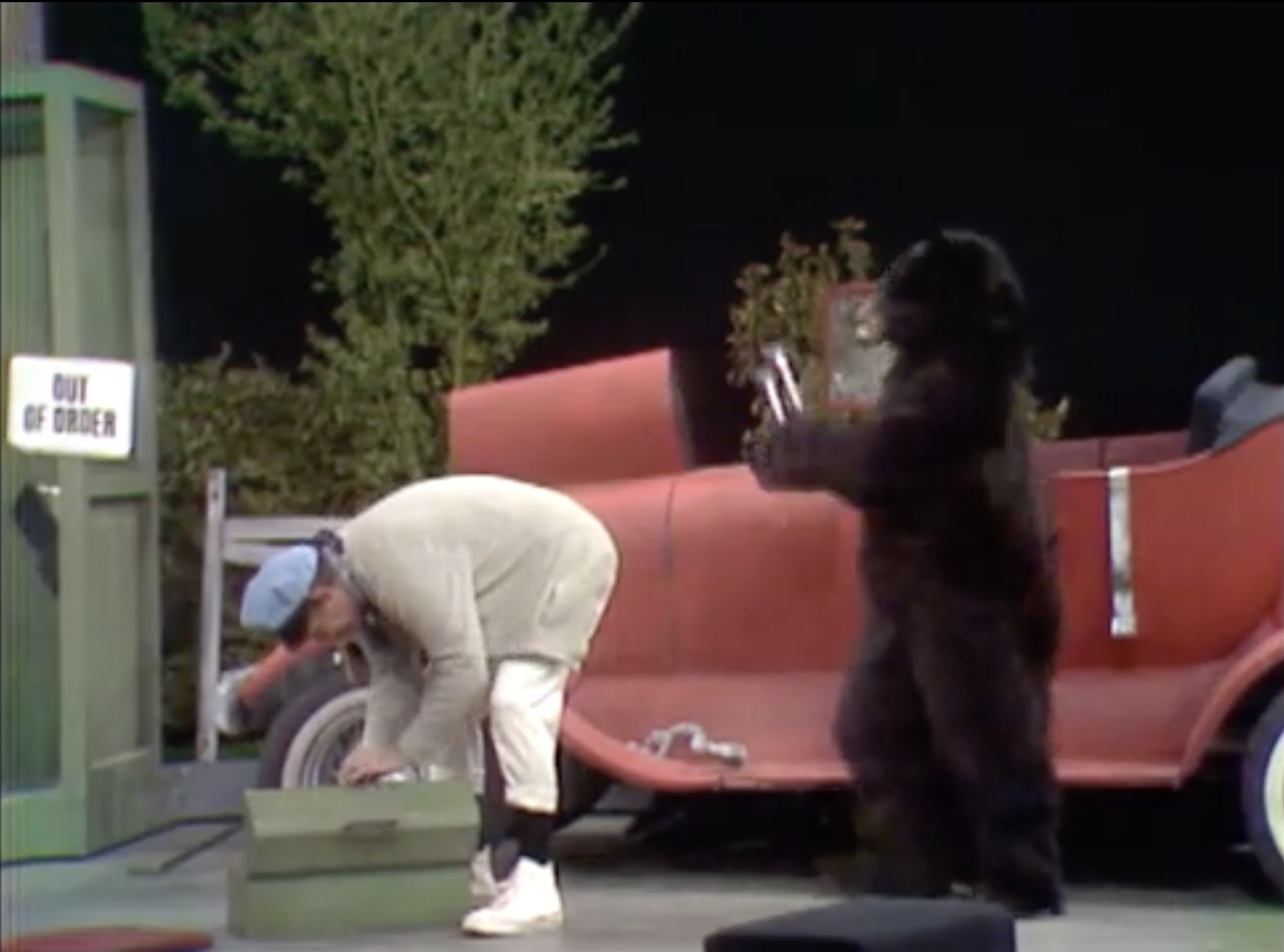 In the Silent Spot, Red portrays the trials and tribulations of a guy with car troubles. It’s a very funny bit, demonstrating visually that anything that can go wrong, will! First he has car trouble, then when his car door falls off, he throws it in anger – giving the front tire a flat! He holds up a lit match to the exhaust, causing a small engine fire! Then, another flat. Then, his car horn is stuck! He throws it away — and hits a bear! He and the bear start fighting, tearing pieces of the car off to attack each other with! Eventually, he gives up, gets into the boat trailer behind the car … And rows it away!
