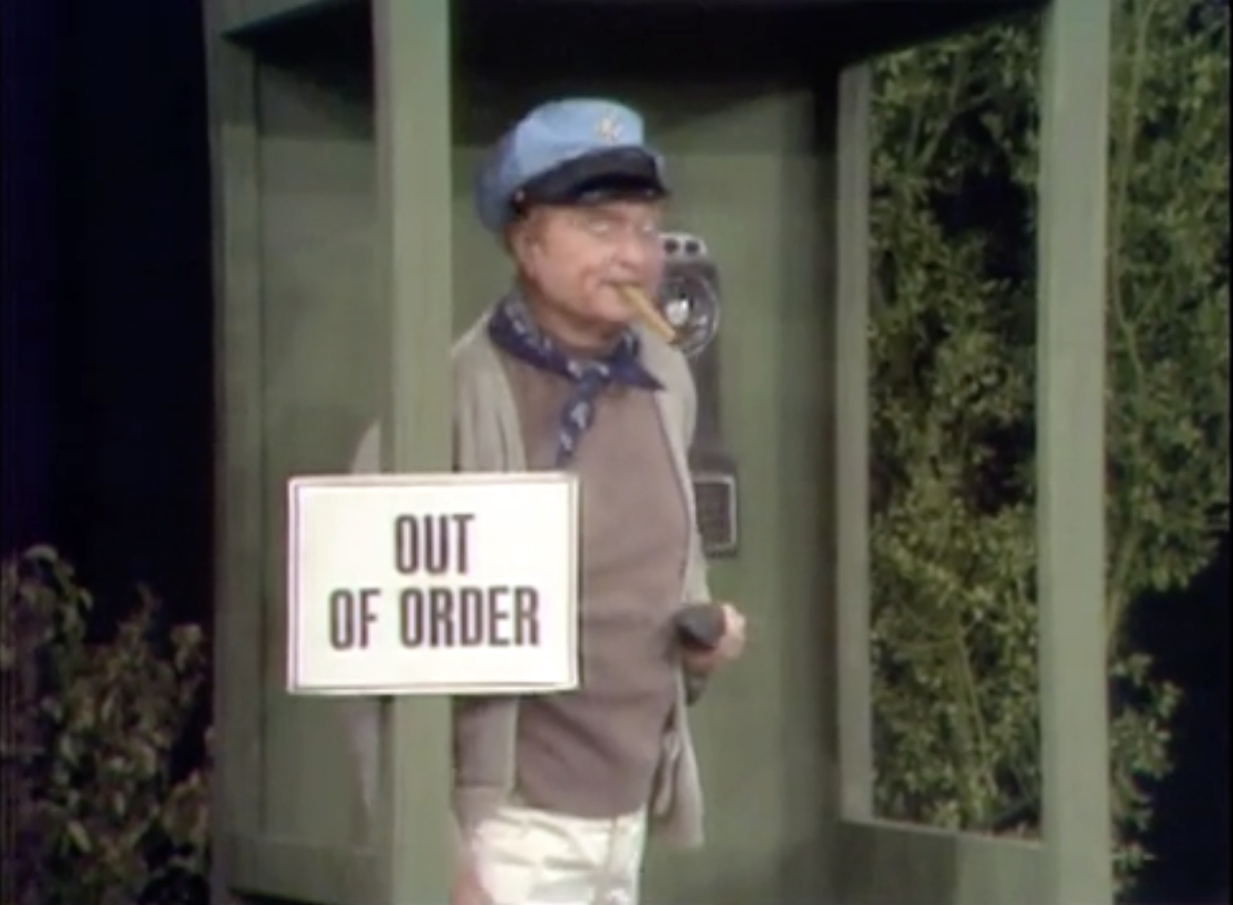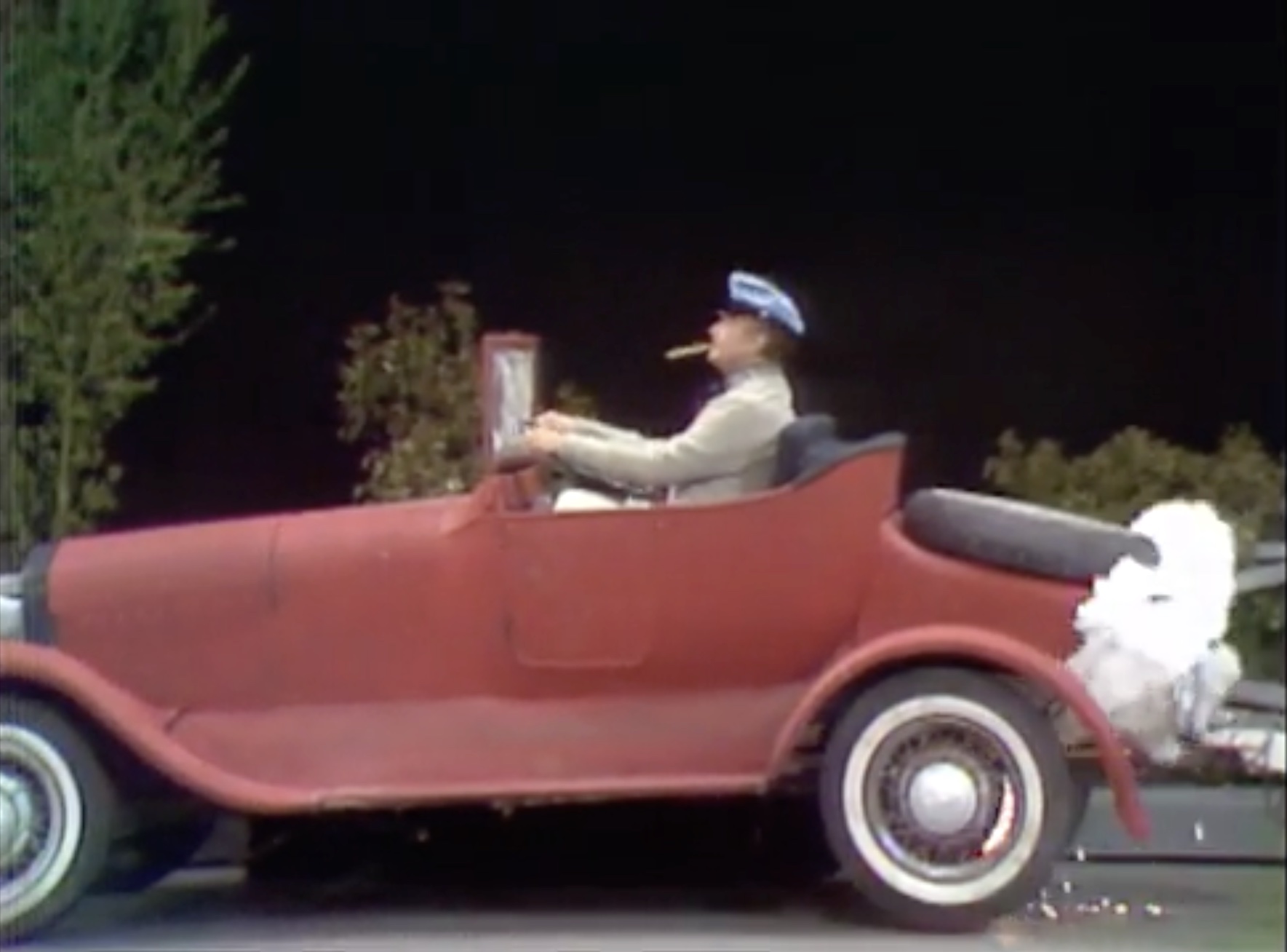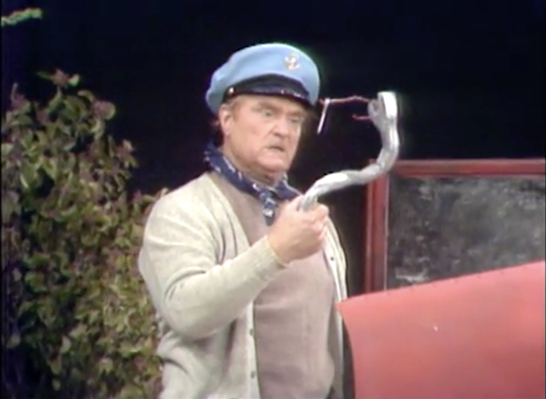 In the Silent Spot, Red portrays the trials and tribulations of a guy with car troubles. It’s a very funny bit, demonstrating visually that anything that can go wrong, will! First he has car trouble, then when his car door falls off, he throws it in anger – giving the front tire a flat! He holds up a lit match to the exhaust, causing a small engine fire! Then, another flat. Then, his car horn is stuck! He throws it away — and hits a bear! He and the bear start fighting, tearing pieces of the car off to attack each other with! Eventually, he gives up, gets into the boat trailer behind the car … And rows it away!