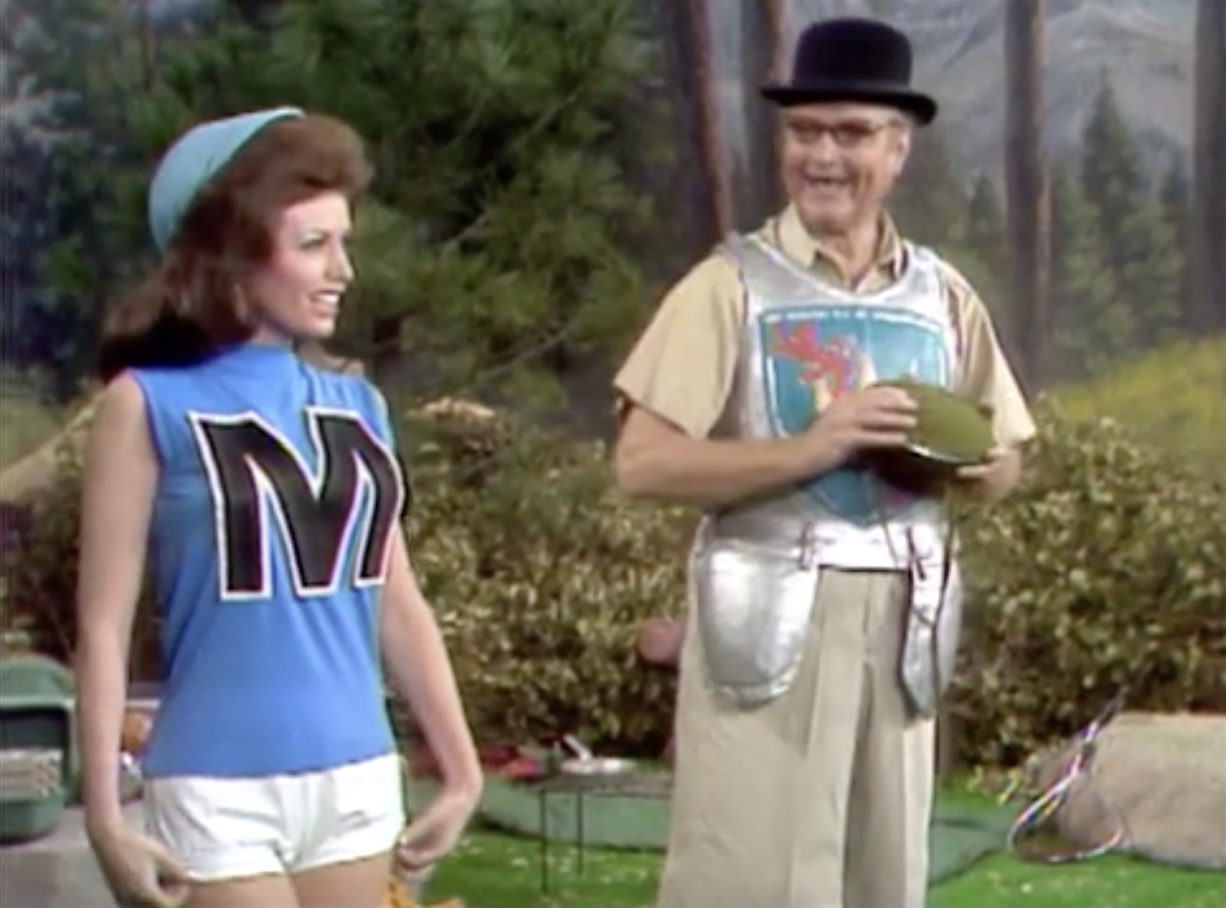 A sexy camp counselor comes by, and after a moment, embraces George in a long, protracted kiss. Which he milks for all the comedy he can get! After she leaves, Henry and Clara comes back, and George thinks he’s been shot! After milking that, Henry explains that Clara loves George, and just bought $10,000 work of stock with her own money. All’s well — and then Alice comes back with her boy campers, and takes Henry captive with her smile! George follows, and Clara threatens to shoot him, ending the sketch.