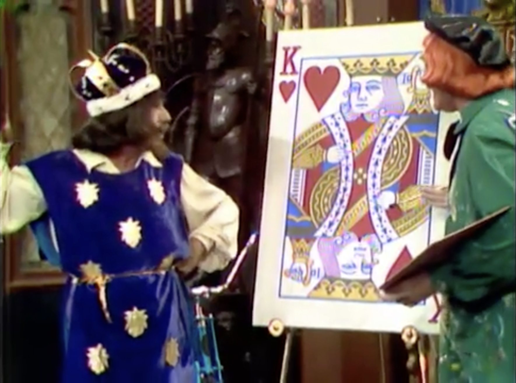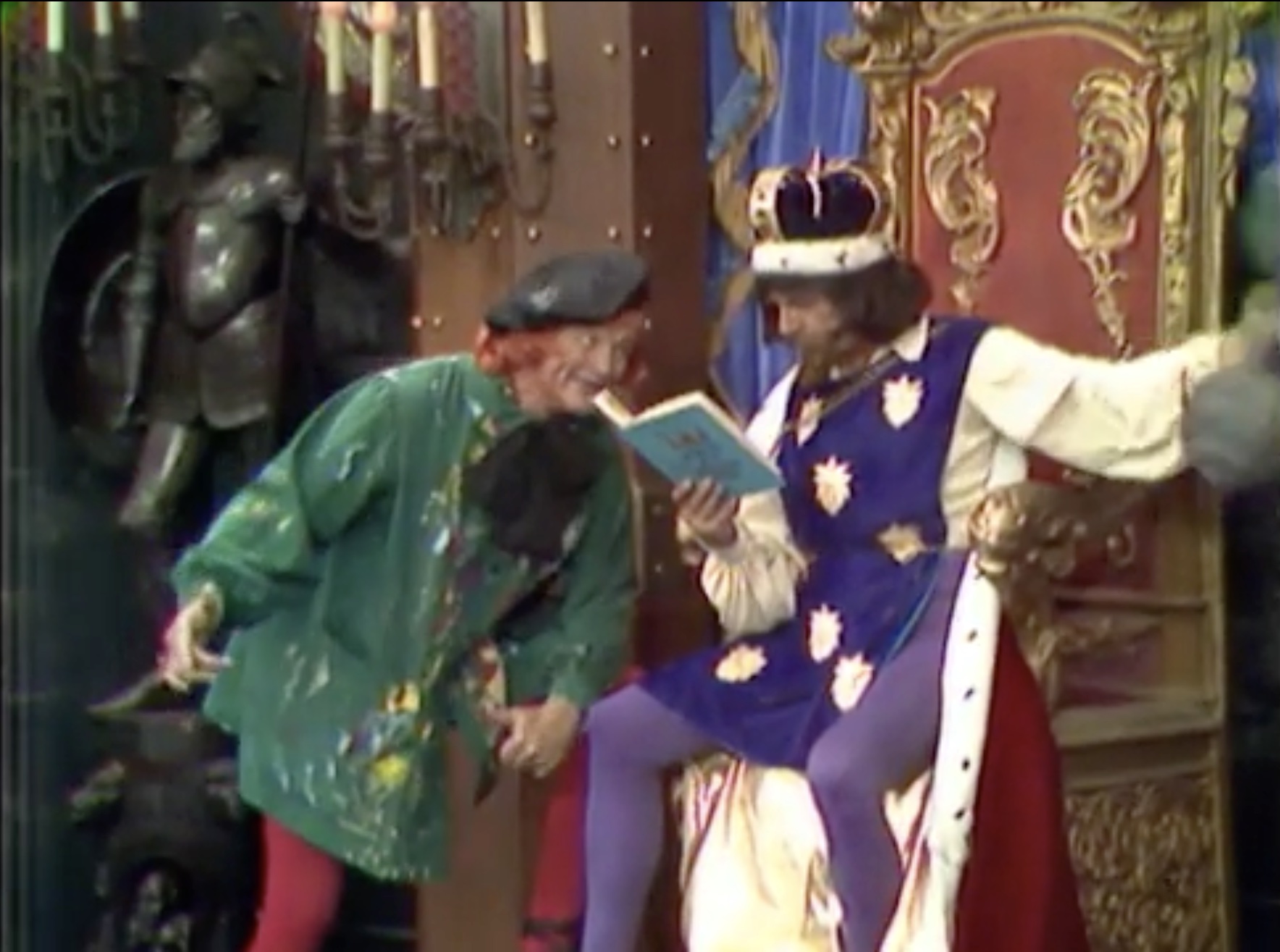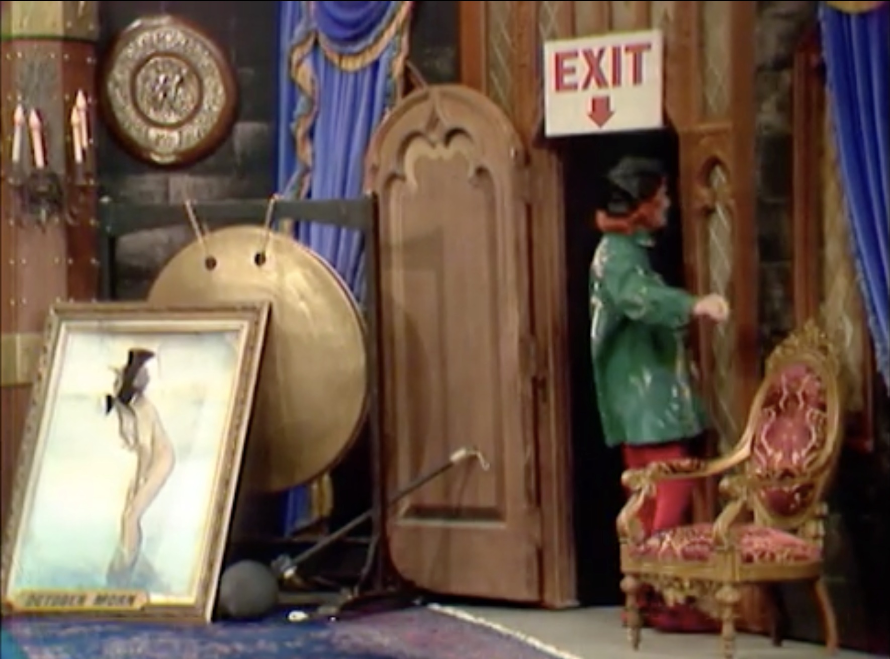 In the Silent Spot, set in the Middle Ages Forsooth portrays a hard-luck artist who is having trouble getting the king, an exercise and health nut, to sit still for his portrait. It’s a funny bit with a lot of prop humor, as Forsooth fights with the various exercise equipment. And there’s a running gag of people hitting their head against the doorframe on the way out, which becomes relevant at the end. And there’s a series of “samples” for the king — my favorite is “Custer’s First Stand”.