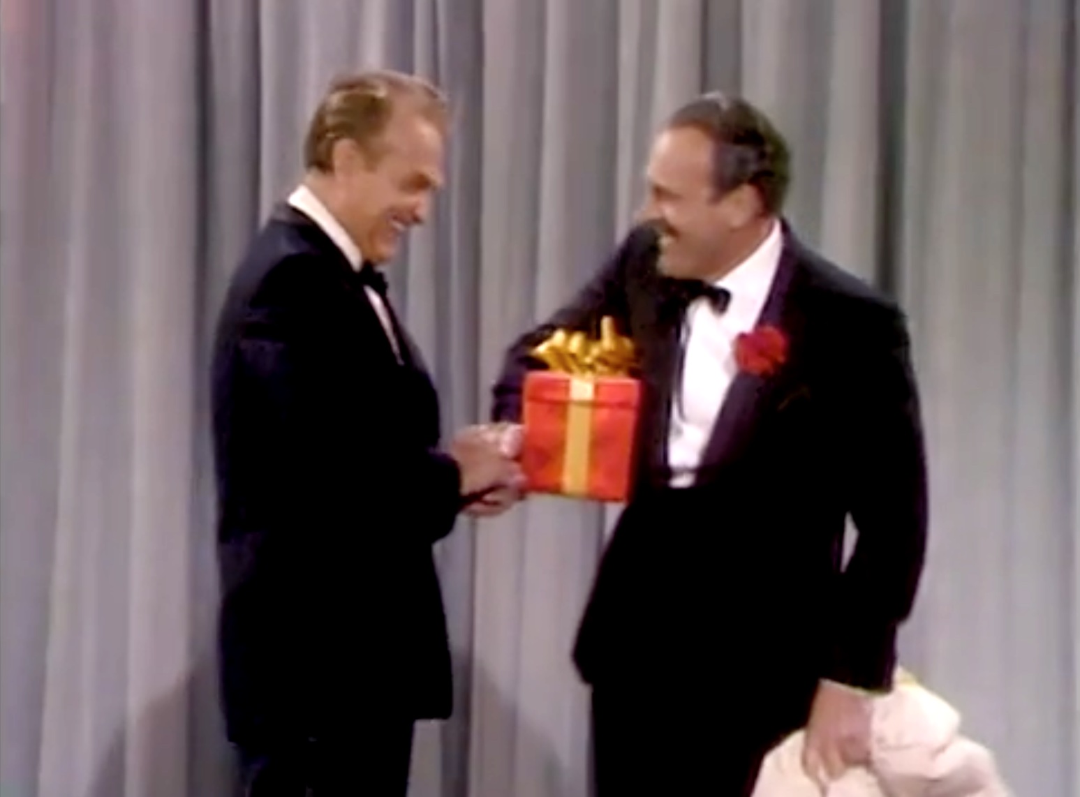 Terry-Thomas joins Red Skelton on stage, bearing gifts. The first is an enormous tea bag! If Red puts it in his pool, he’ll have the largest cup of tea in the world! Then, from a gift-wrapped box, Terry-Thomas pulls out the model of a car. What is it? An Edsel. Why? Because with all that tea, you’re going to need a lemon!