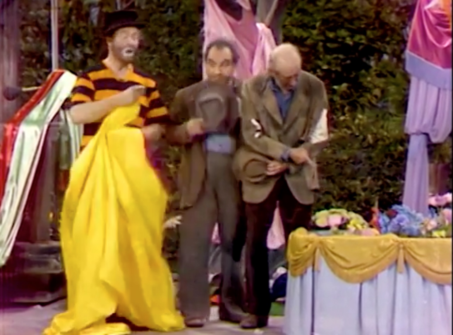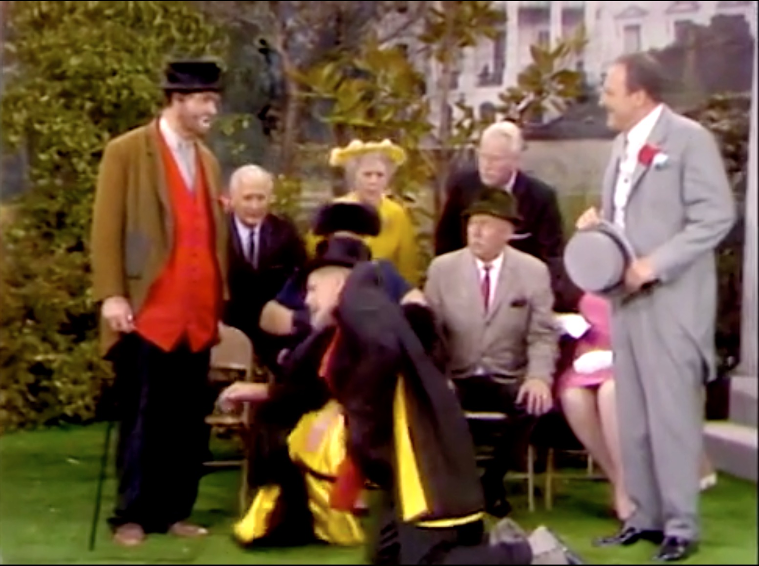 Freddie the Freeloader and his pals appear on the White House lawn. Just in time to ruin Farquardt’s award ceremony! After a running gag of “borrowing” an elderly ambassador’s cane so he falls down, Freddie identifies himself as the “yellow blob” in the photo of Farquardt’s beautified roadway. After some atrocious chicken puns, Freddie gives an impassioned speech about the hobo — the gentleman of the road. “You’ll do anything to steal a scene, won’t you?” But it’s all a ruse to give his hobo pals time to raid the White House kitchen! The sketch ends with Farquardt joining Freddie on his road trip.