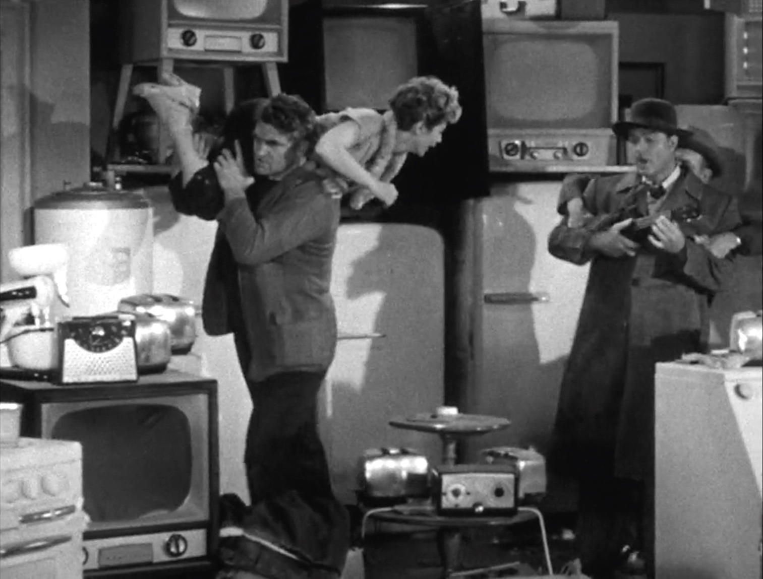 And the quiz shows are calling him at home to participate! He’s afraid to answer the phone …. But despite his wife’s warning, he does so, and wins another trip to Honolulu! Their fifth this month! And when they don’t want to go … Enforces from the game show arrive, to make certain they do!