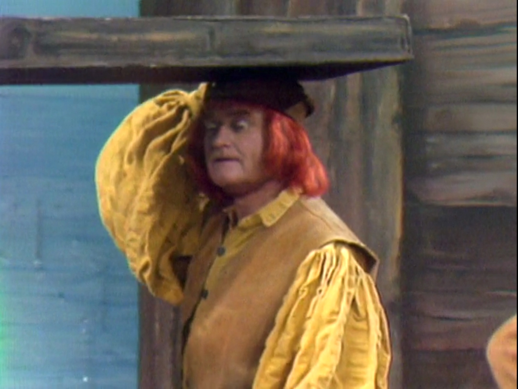 Forsooth Frumpkiss is an apprentice ship builder, driving his poor boss (Jan Arvan to distraction. “Coming, mastoid!” “You mean ‘master’ — a mastoid’s a pain in the neck.” “Coming, mastoid!” Forsooth then does a classic clown bit, picking up a long board and carrying it off stage …. And other the other end of the board, he’s carrying it! “You hold the mallet, and I’ll hold the spike.” “This guys asking for it!”